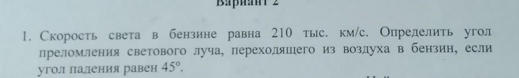n=c/V=300000/210000=1,43 sina/sinb=sina/n= 0,71/1,43=0,5 sinb=30 градусов
