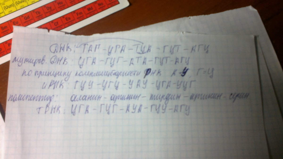 В данном ферменте молекулы ДНК: ГАГЦГАТЦАГЦТАГЦ произошла генная мутация-восьмой нуклеоид переместился на первое место. Определите последовательность нуклеотидов в фрагменте молекулы ДНК, антикодоны т-РНК, виды и порядок аминокислот, которые кодируют фрагмент и-РНК. Используйте таблицу генетического кода.