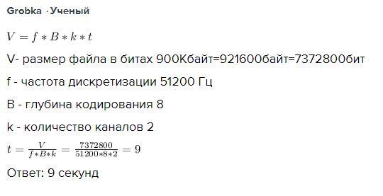 Двухканальная (стерео) запись имеет информационный объём 900 Кбайт, полученный при частоте дискретизации 51200 Гц и разрешении 8 бит. Сколько секунд длится стерео запись?