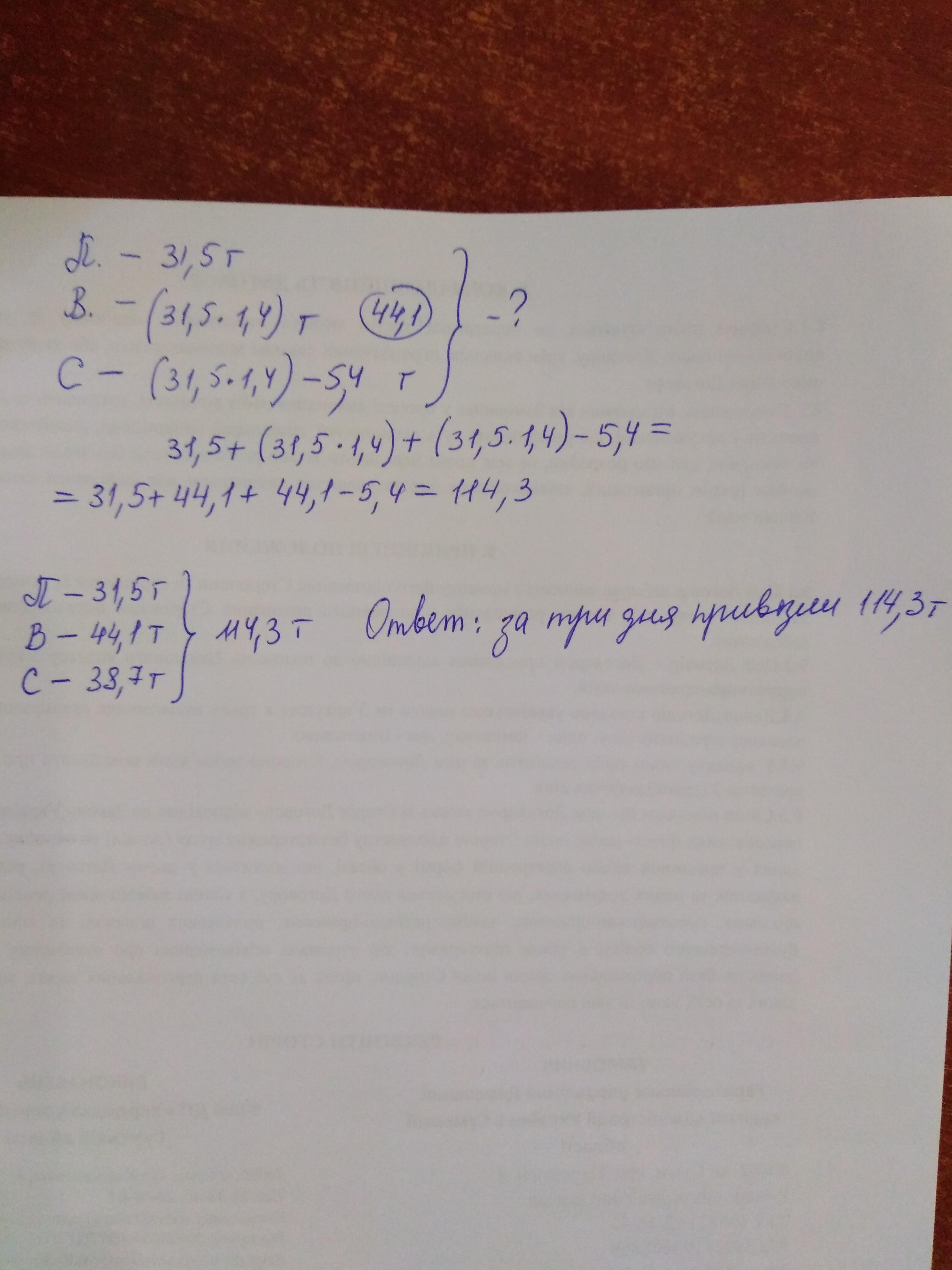 3)31,5+44,1+38,7=114,3(т)-привезли всего на базу за 3 дня.
