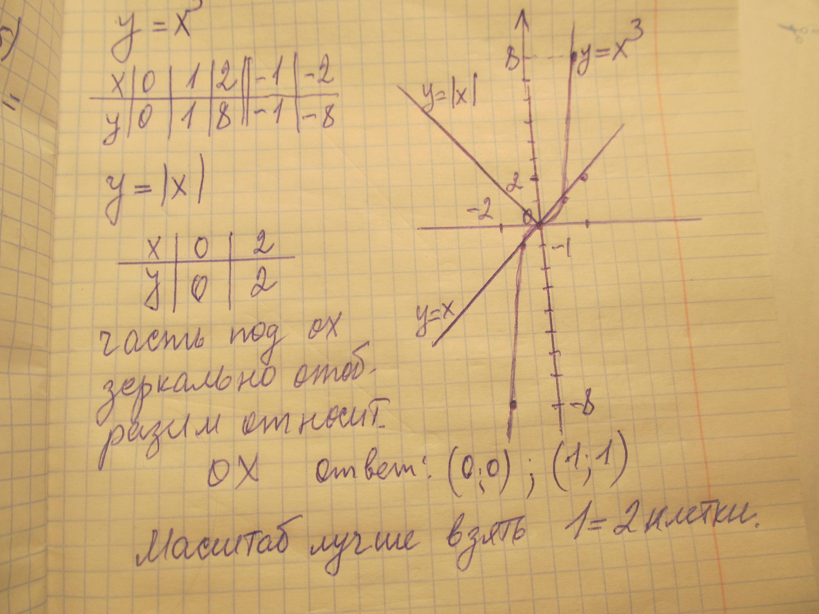 Постройте графики функций y=x³ и y=|x| в одной системе координат и найдите координаты их общих точек.