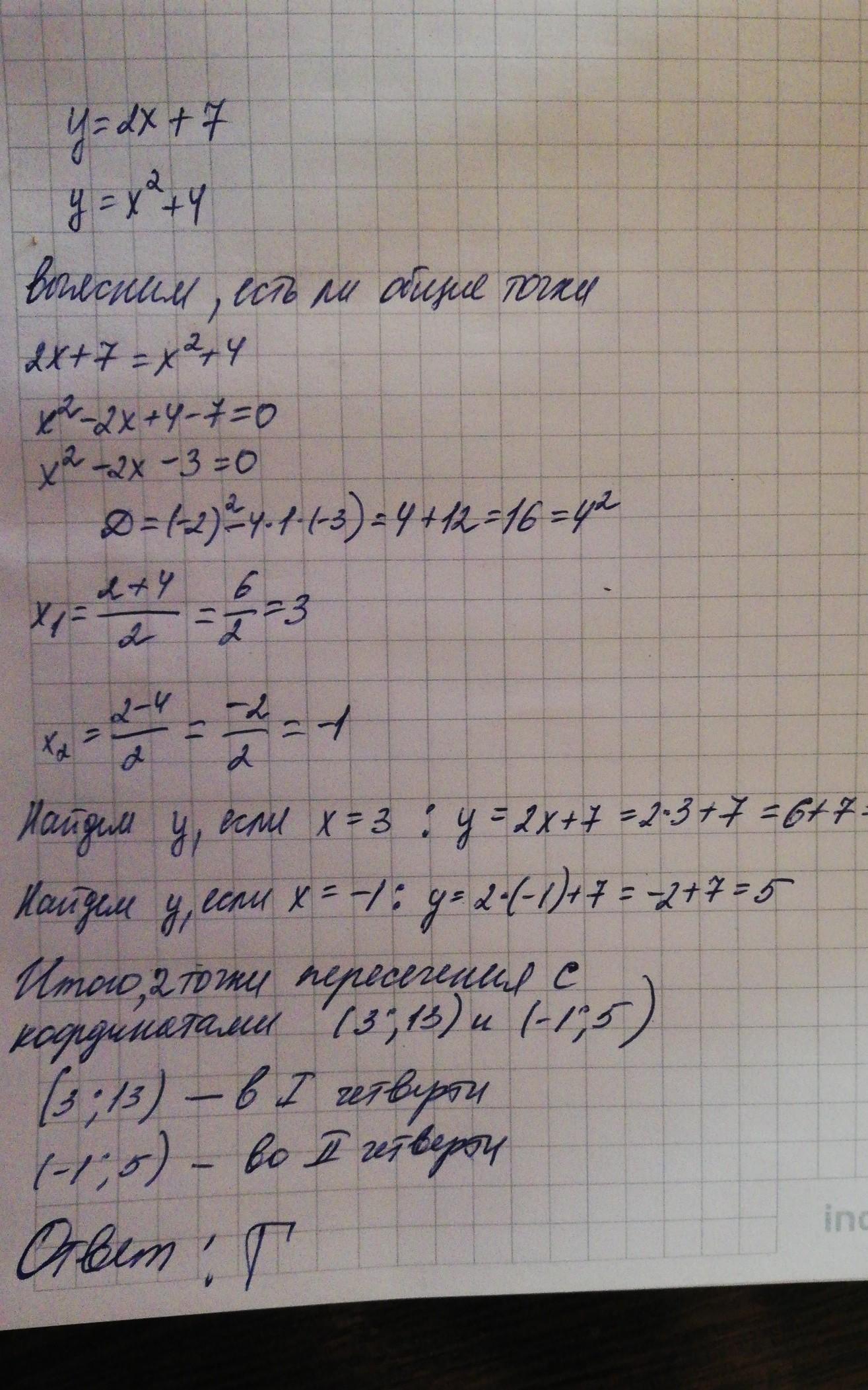 Объяснение: пересекаются,если имеет корни уравнение х^2+4=2x+7