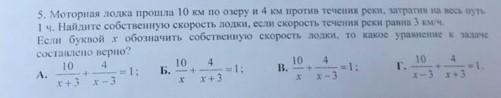 Когда моторная лодка доплывет до реки, она начнет движение против течения(по условию) 4 км. Данное течение влияет на скорость моторной лодки, из х-3(т.к. лодка плывет против течения), ну и каждый участок делим на скорость и получаем время, которое затем складываем и приравниваем к 1.
