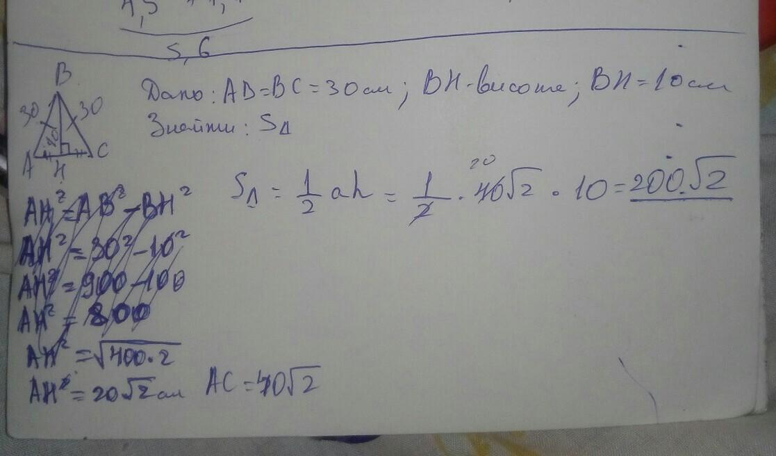 Бічна сторона рівнобедреного трикутника дорівнює 30см,а висота,проведена до основи,10см,Обчисліть площу данного трикутника.Писати з дано і так далі якщо є можливіть то прикріпіть малюнок