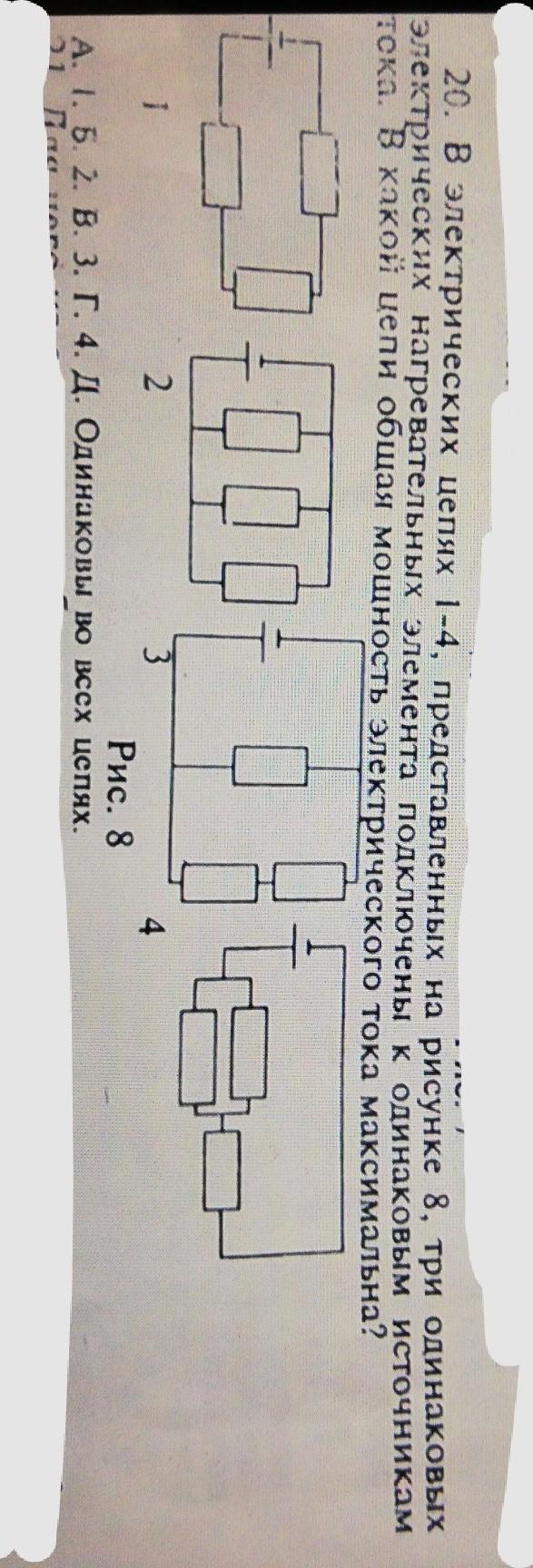 В электрических цепях 1-4, представленных на рисунке 8, три одинаковых электрических нагревательных элемента подключены к одинаковым источника тока. В какой цепи общая мощность электрического тока максимальна?