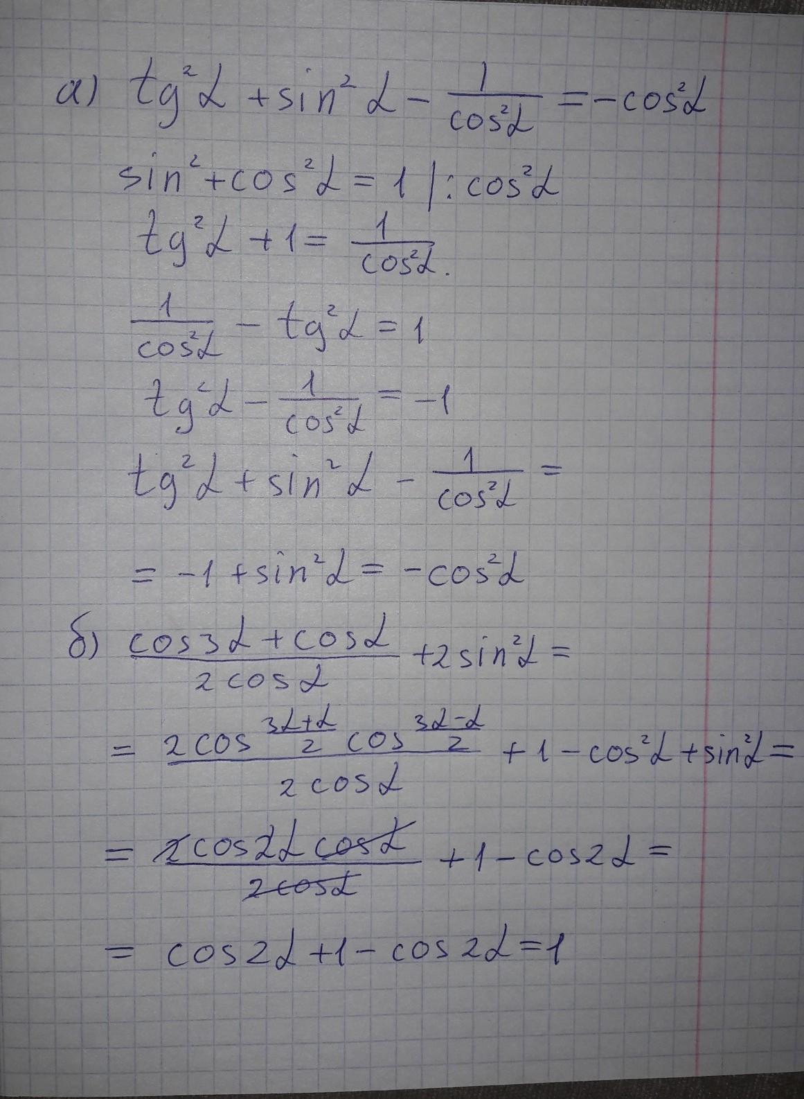 б) cos(3α) + cos(α)/2cosα + 2sin(α)^2 = 2cos(2α)cos(α)/2cos(α) + 1 - cos(2α) =