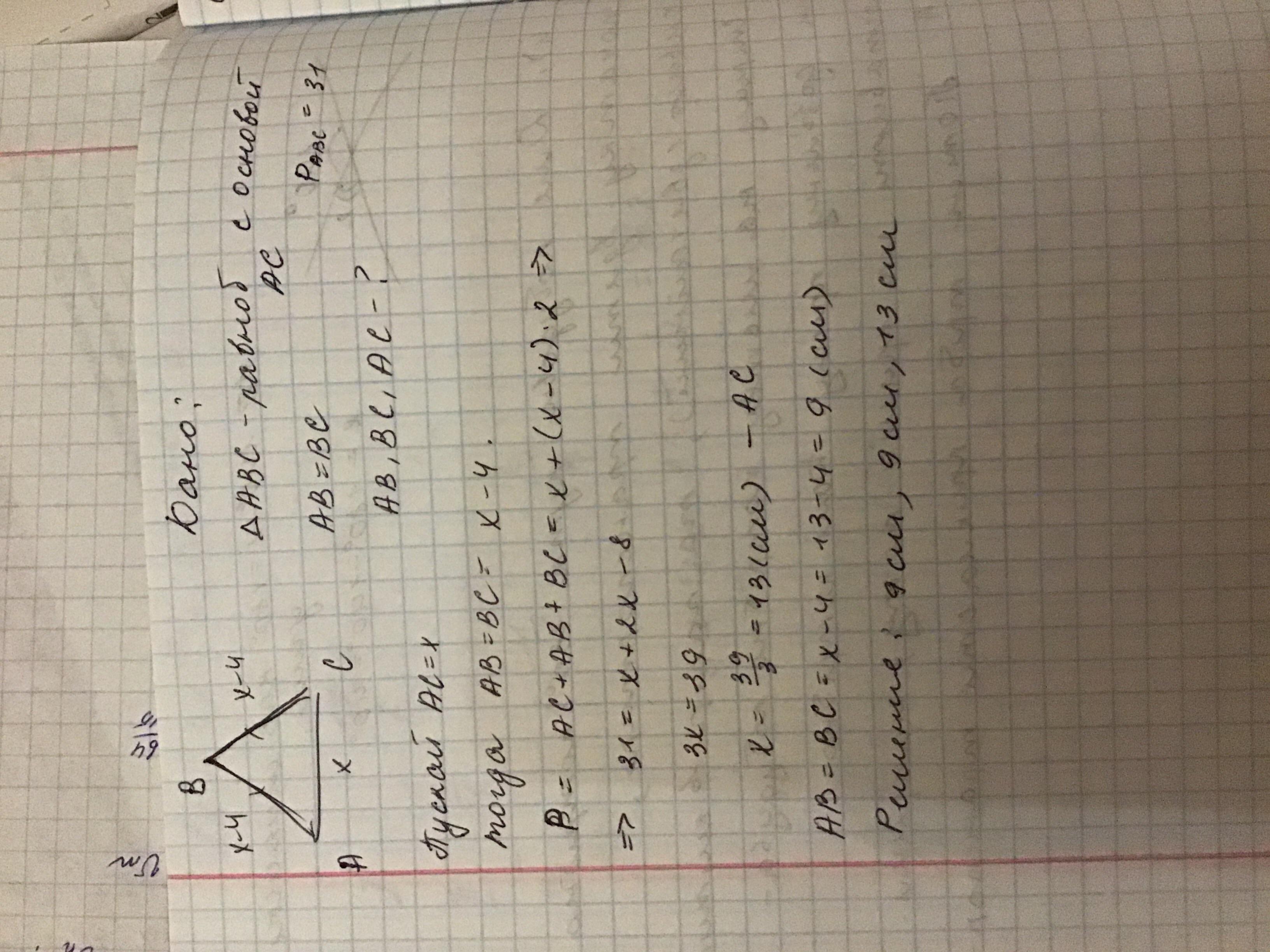 пусть основа равна х тогда боковая сторона равна (х-4) так как она на 4 см меньше основания тогда вторая сторона тоже равна (х-4) периметр равен суме этих двух сторон и основания получается уравнение х+х-4+х-4=31