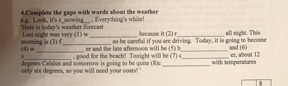 1 windy 2 raining 3 foggy 4 warmer 5 hot 6 sunny 7 colder 8 cold