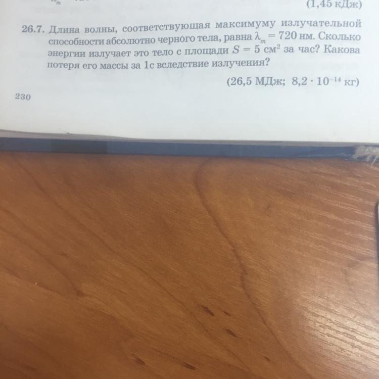 По закону Вина L=b/T T=b/L=3*10^-3/720*10^-9=4000 K По закону Стефана- Больцмана R=сигма*T^4 Ф=R*S E=Ф*t=сигма*T^4*S*t=5,7*10^-8*4000^4*5*10^-4*3600= 26500000=26,5 МДж m=E/c^2=26,5*10^6/9*10^16*3600=8,2*10^-14 кг