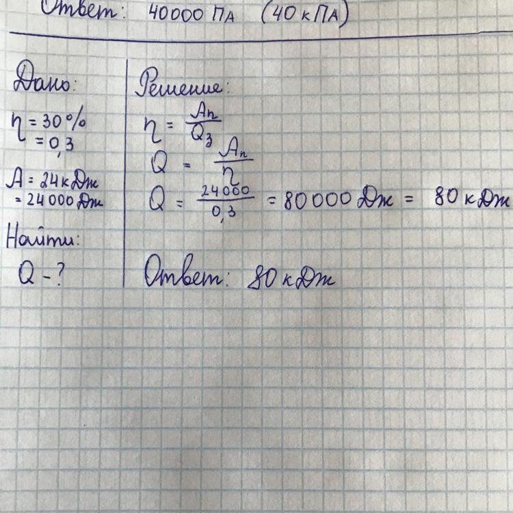 Двигатель с к.п.д 30% совершил работу 24 кДж. каково полученное тепло ? (решите пж с "дано" и ТД. )