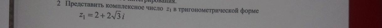 |z|=√(2²+(2√3)²)=4, ф=arctg(2√3/2) =60°, z=4(cos60+sin60*i) -ответ