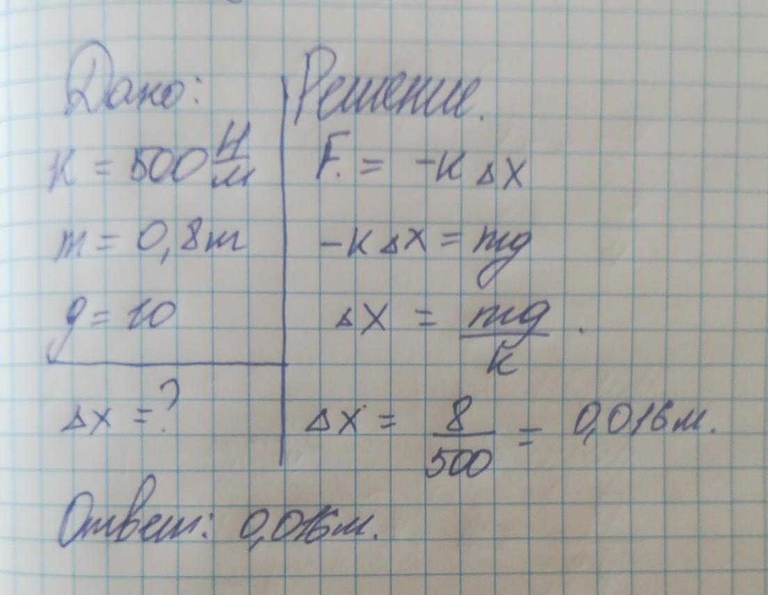 К нижнему концу недеформированной пружины жесткостью 500Н/м прикрепляют тело массой 800 г и отпускают без толчка. Найдите максимальную деформацию пружины в процессе дальнейшего движения.