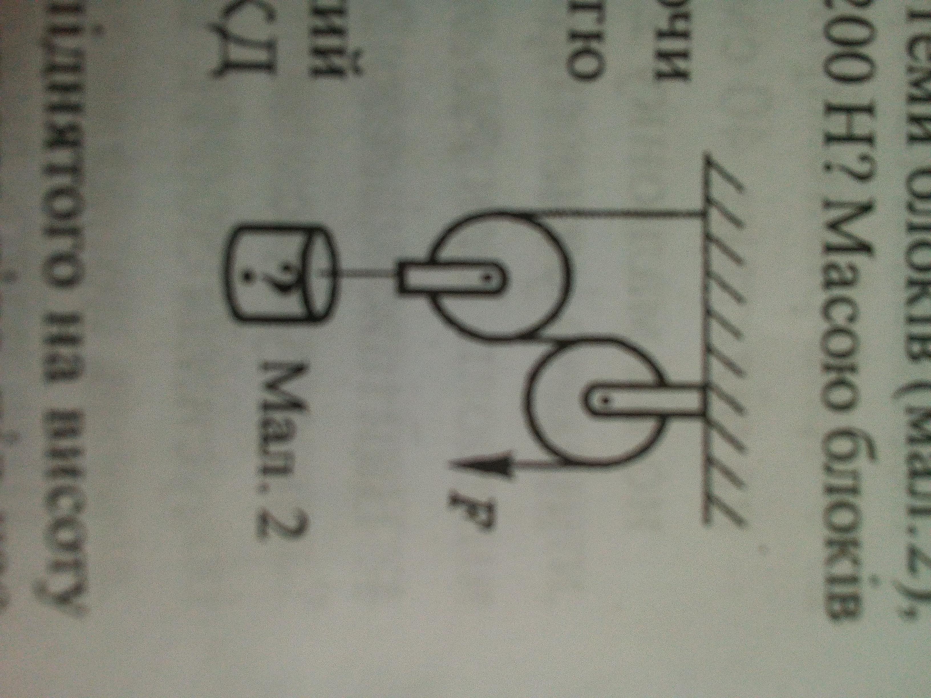 Вантаж якої маси можна підняти за допомогою системи блоків якщо до вільногокінця мотузки прикладена сила F=200Hмасу блоків і тертям знехтувати