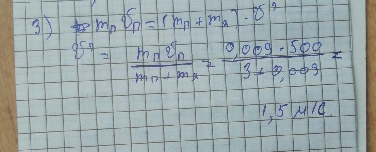 3)Якої швидкості руху набере ящик масою 3 кг якщо в нього потрапить куля масою 9 г, яка влучила зі швидкістю 500 м/с