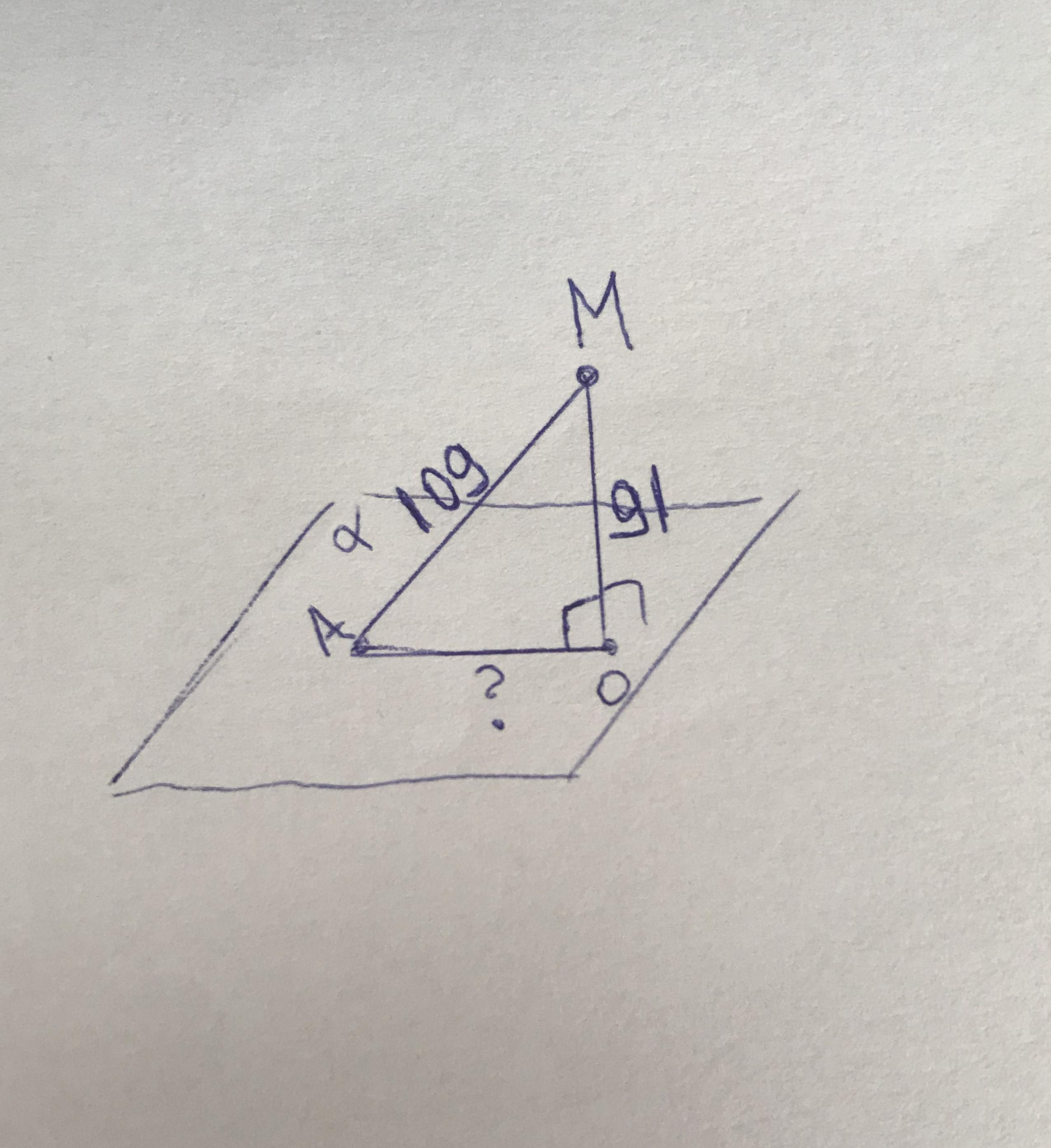 Из точки М взятой вне плоскости альфа проведены к ней перпендикуляр MO и наклонная MA. Вычислить проекцию MA на плоскость альфа если MO = 91см, MA = 109 см