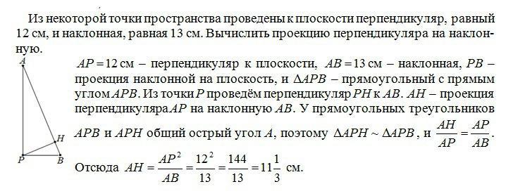 Из некоторой точки пространства проведены к данной плоскости перпендикуляр, равный 12см, и наклонная , равная 13см. Вычислить проекцию перпендикуляра на наклонную.