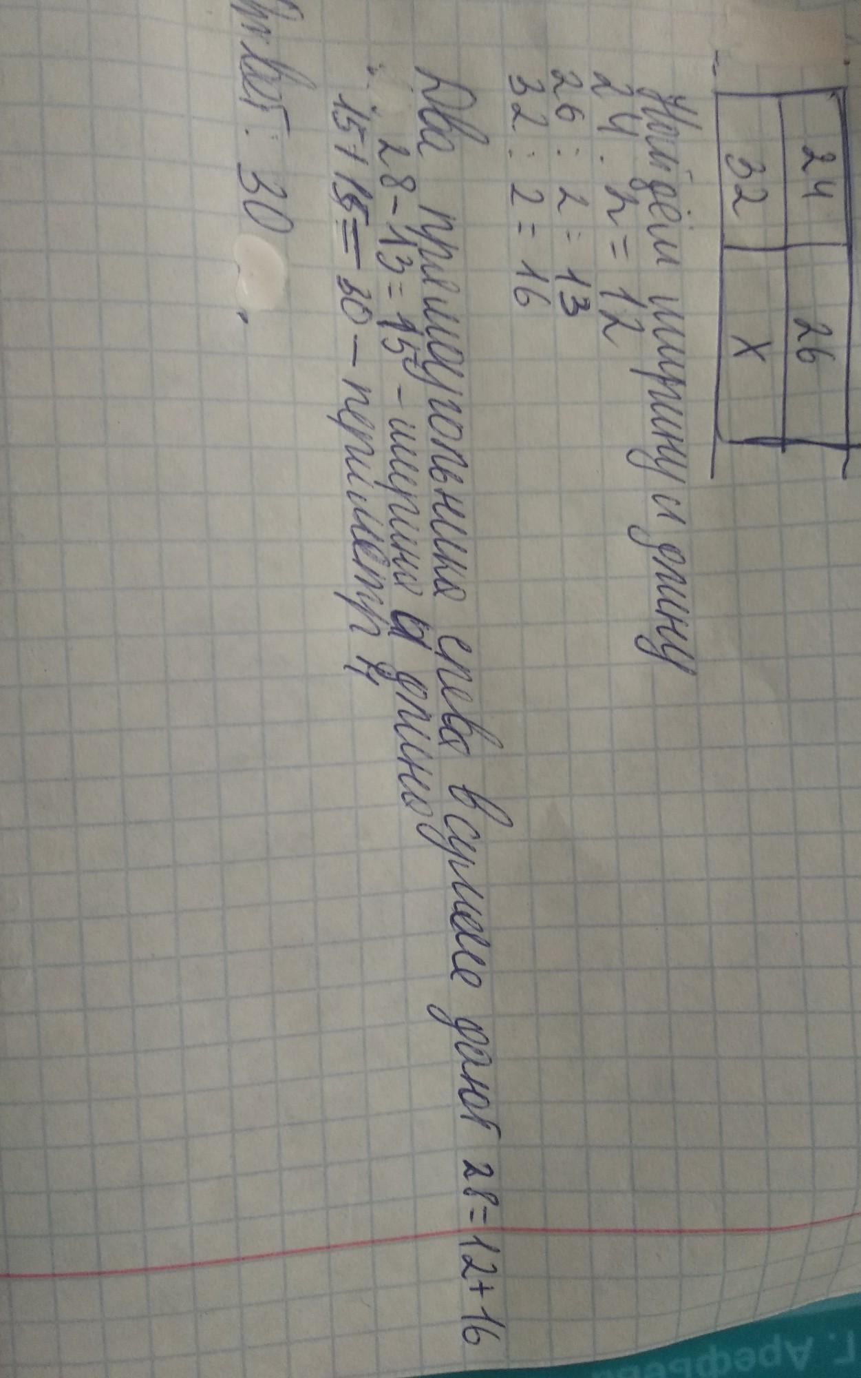 Периметры трёх из них, начиная с левого верхнего и далее по часовой стрелке равны 24, 26 и 32.