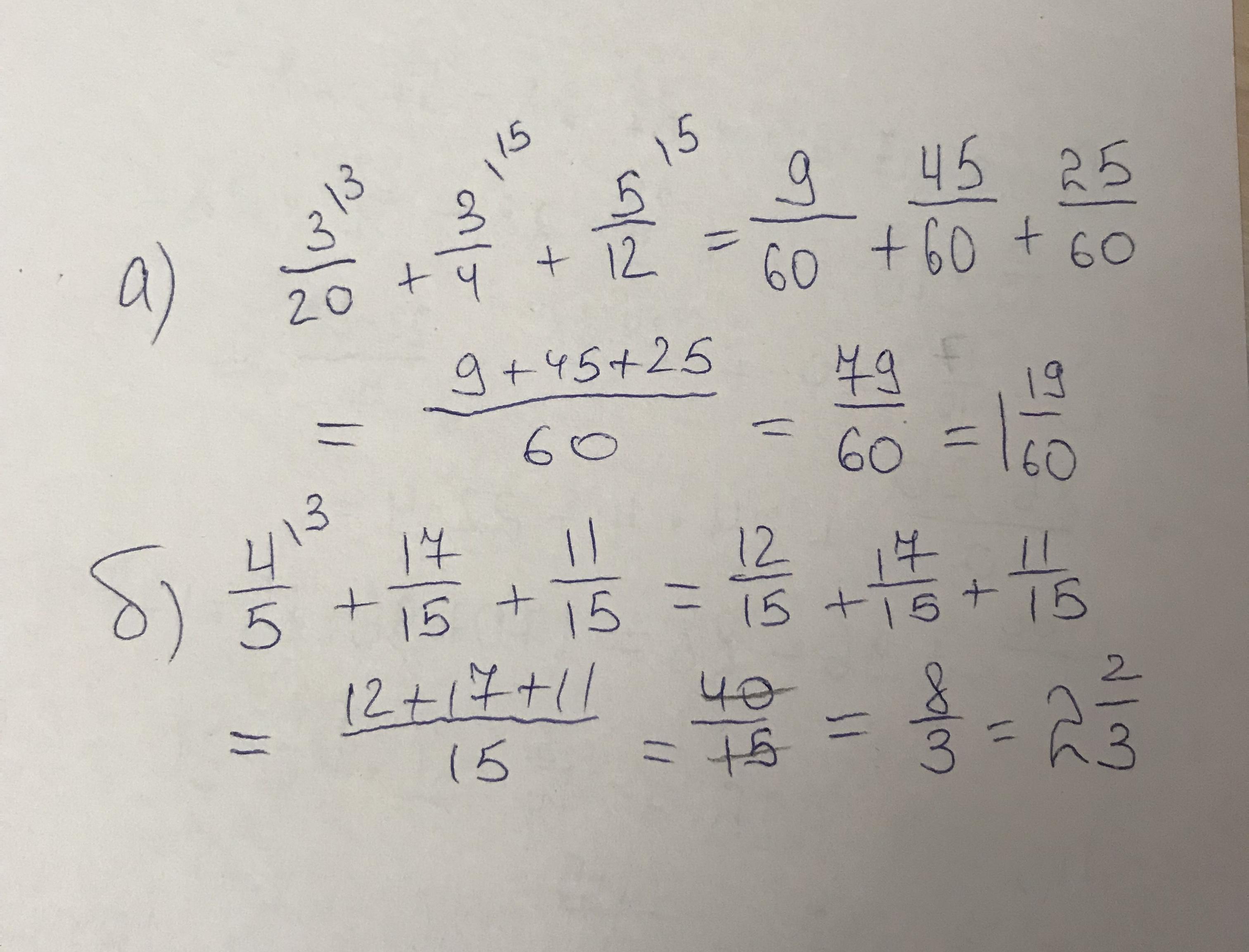 Пошаговое объяснение: нужно свести все числа к общему знаменателю, только потом можно добавлять числители. В конце по возможности сократить