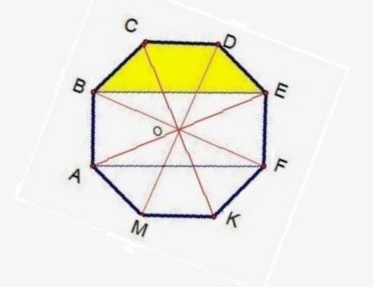 Проведем биссектрисы углов восьмиугольника, они пересекутся в точке О. Площадь восьмиугольника: (ABCDEFKM) =8* S (OEF).