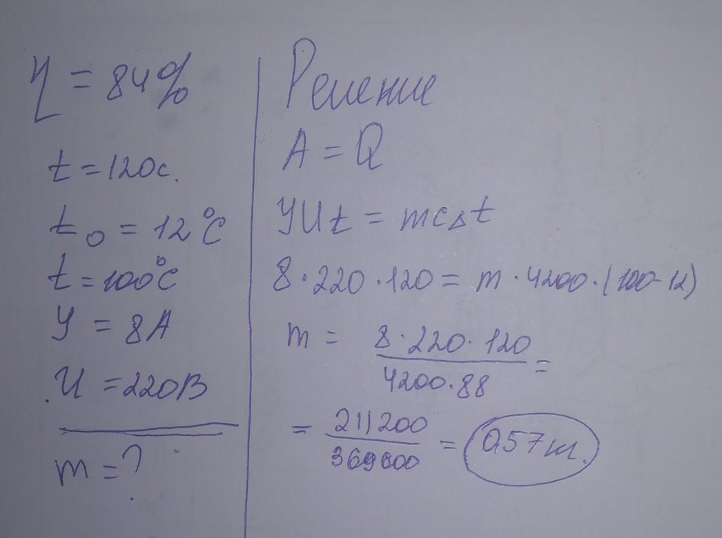 задача вода яку налили в електричний чайник з ККД 84% закипіла за 2.хв визначте масу налитої води у кг якщо її початкова температура становила 12 сила струму в нагрівальному елементі чайника 8 А а напруга 220В