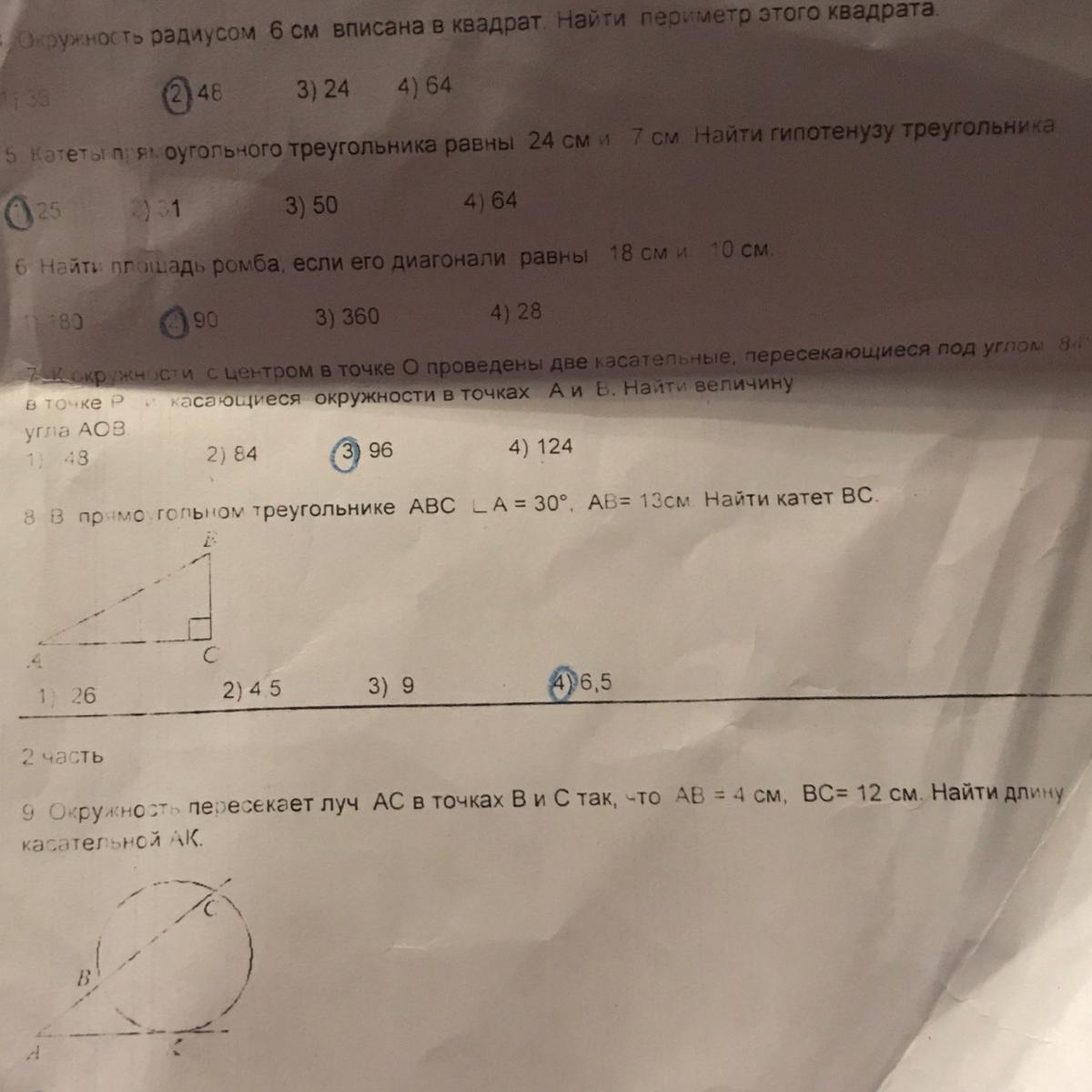 9. АВ*АС=4*(4+12)=квадрат касательной , тогда касательная =√(4*16)=2*4=