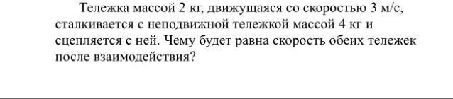 Применим закон сохранения импульса: m1*V1=(m1+m2)*V V=m1*V1/(m1+m2)=2*3/(2+4)=1 м/с