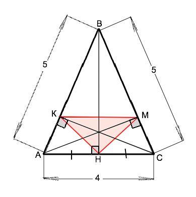 Медианы прямоугольных треугольников равны половине гипотенузы.. КН=МН=4:2=2. Следовательно, АН=КН, СН=МН, – ∆ АКН и ∆ СМН равнобедренные, при этом углы при их основаниях равны углам при основании ∆ АВС. Поэтому