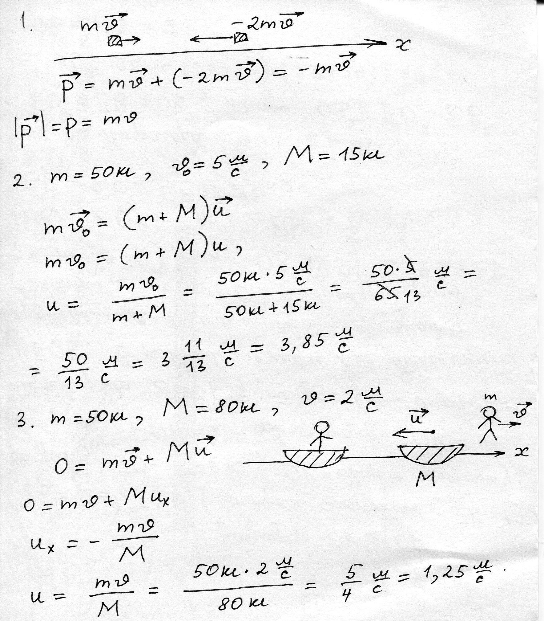 2- мальчик массой 50 кг бежит со скоростью 5м/с,догоняет стоящую тележку массой 15 кг и вскакивает на нее . С какой скоростью станет двигаться тележка с мальчиком после этот?
