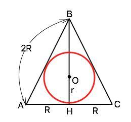 Радиус r окружности, вписанной в правильный треугольник, равен 1/3 высоты этого треугольника ( высоты конуса). r=OH=(R√3):3=R/√3