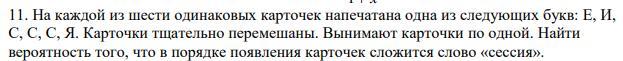 чтобы найти вероятность события А ="сложится слово сессия", надо найти число благоприятствующих исходов, общее число исходов и первый результат поделить на второй, согласно классическому определению вероятности. Число всех исходов равно числу перестановок Р(3;1;1;1)=6!/(3!*1!*1!*1!)=4*5*6=120, это перестановки с повторениями, т.к. буква с в слове повторяется три раза,искомая вероятность равна 1/120, т.к. из данных букв слово сессия образует лишь один исход.