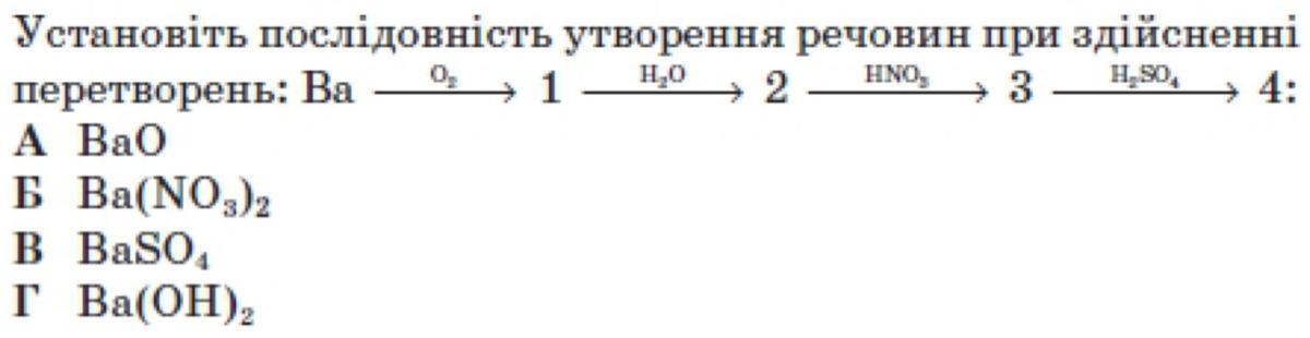 Последовательность:А)BaO-Г)Ba(OH)2-Б)Ba(NO3)2-В)BaSO4