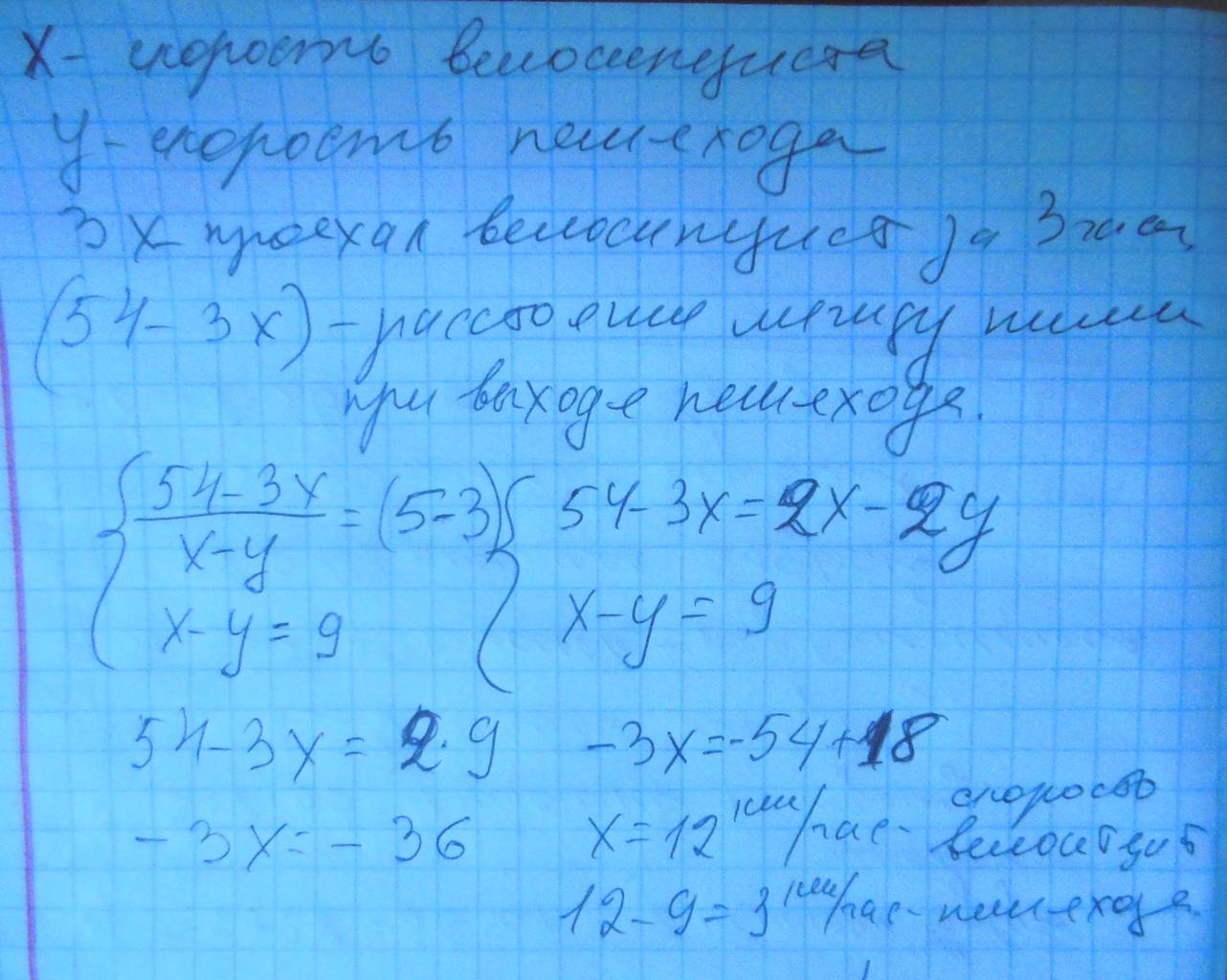 Из пункта А в пункт В, расстояние между которыми 54 км. Выехал велосипедист, через 3 часа после этого из пункта В в направлении, совпадающим с направлением движения велосипедиста, вышел пешеход. Найти скорость каждого, если известно, что велосипедист догонит пешехода через 5 часов после своего выезда из пункта А. Скорость пешехода на 9 км/ч меньше скорости велосипедиста.