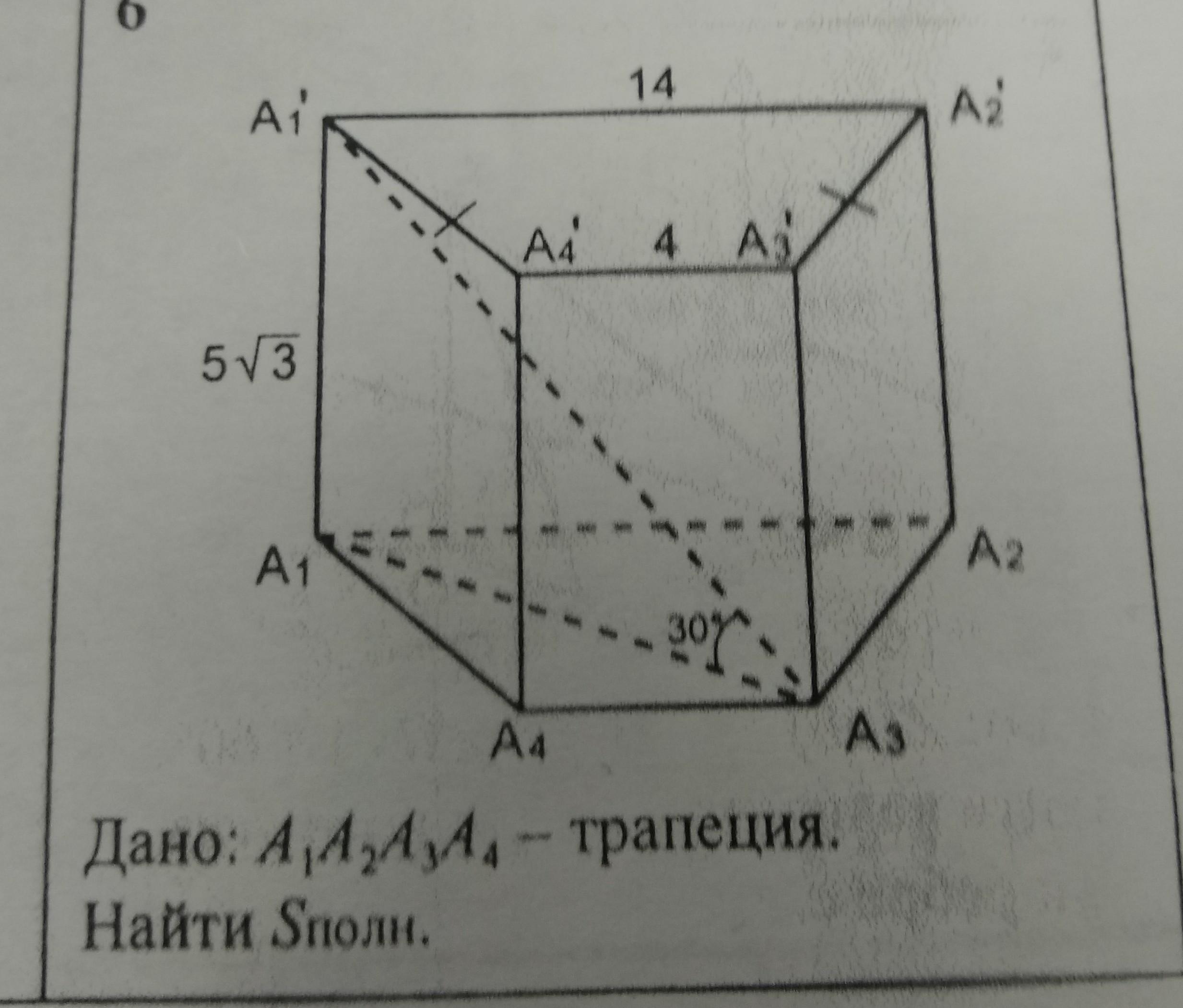 Дана прямая призма, в основании которой равнобокая трапеция с основаниями 4 и 14. Угол диагонали равен 30 градусов.