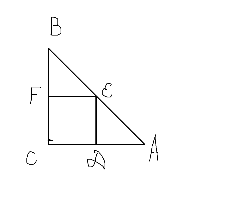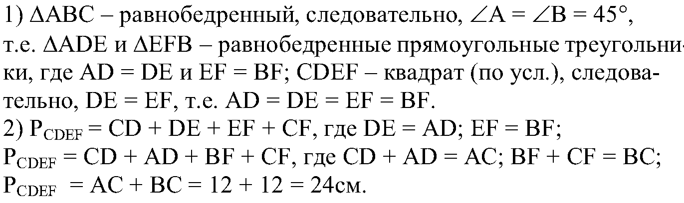 Даны равнобедренный прямоугольный треугольник АВС с прямым углом С, катетом АС=12 см и квадрат CDEF, такой, что две его стороны лежат на катетах, а его вершина Е на гипотенузе треугольника.Найдите периметр квадрата CDEF.
