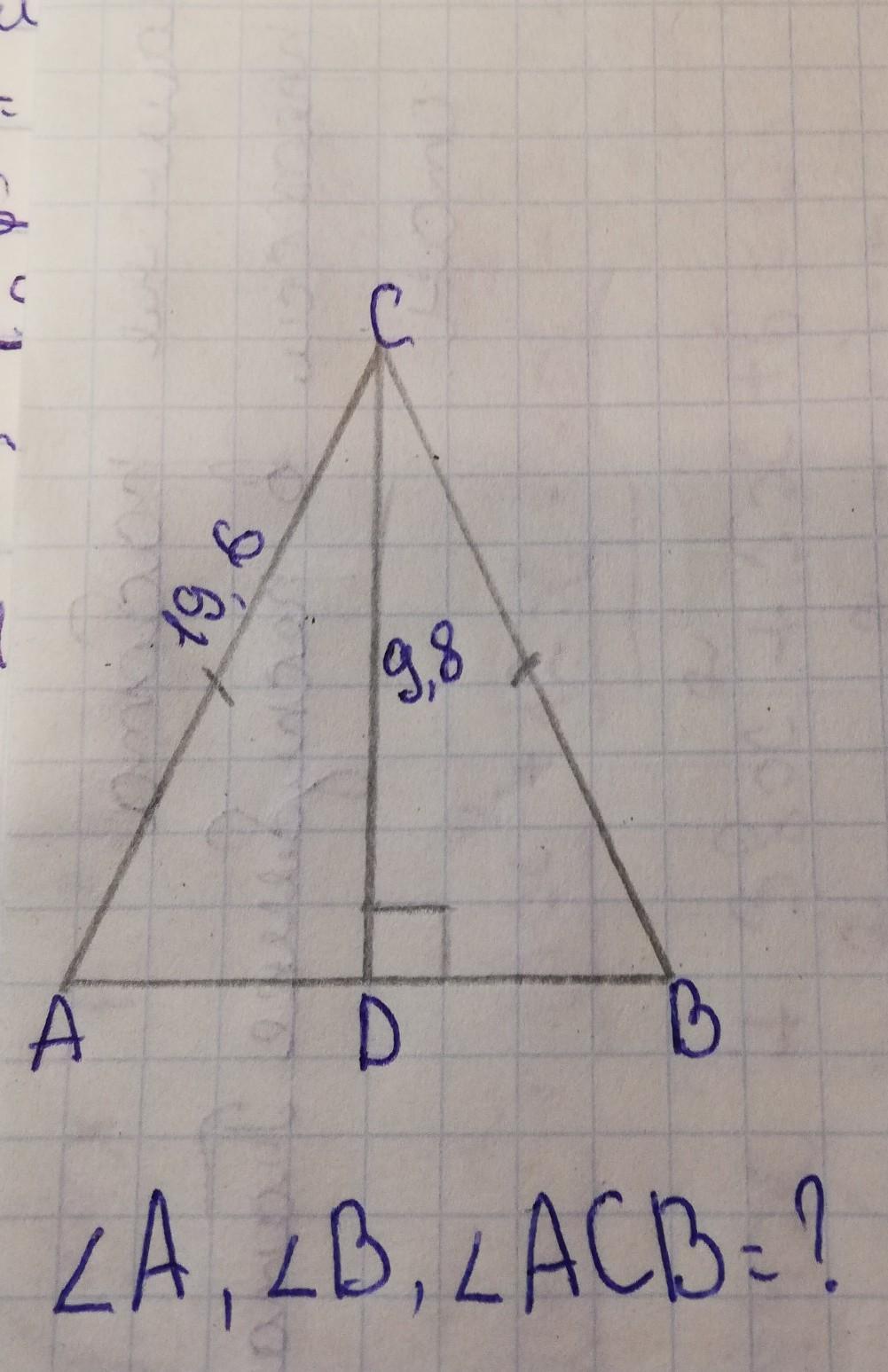 Так как у треугольника боковые стороны равны, то он равнобедренный, значит угол А равен углу В. треугольник СDA прямоугольный, так как угол СDA прямой. Можно заметить что катит CD равен половине гипотенузы AC. Мы знаем, что против угла в 30° лежит катит, равный половине гипотенузы, значит угол А = 30°, значит угол A = угол B = 30°. Сумма углов треугольника равна 180°. Значит угол ACB = 180 - A - B, значит угол ACB = 120°