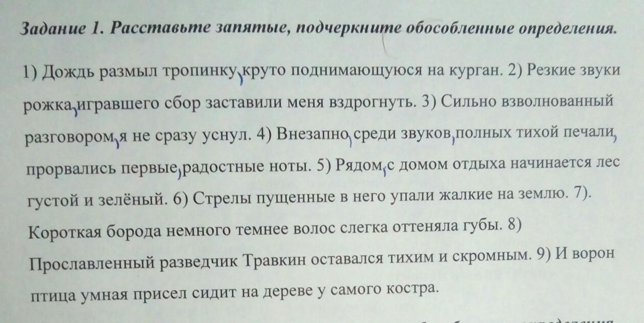 1) дождь размыл тропинку, /круто поднимающуюся на курган/. 2) резкие звуки рожка, /игравшего сбор/, заставили меня вздрогнуть. 3) /сильно взволнованный разговором/, я не сразу уснул. 4) внезапно среди звуков, /полных тихой печали/, прорвались первые радостные ноты. 5) рядом с домос отдыха начинается лес, /густой и зелёный/. 6) стрелы, /пущенные в него/, упали жалкие на землю. 7) короткая борода, /немного темнее волос /, слегка оттеняла губы. 8) прославленный разведчик, /Травкин/, оставался тихим и скромным. 9) и ворон, /птица умная/, присел, сидит на дереве у самого костра.
