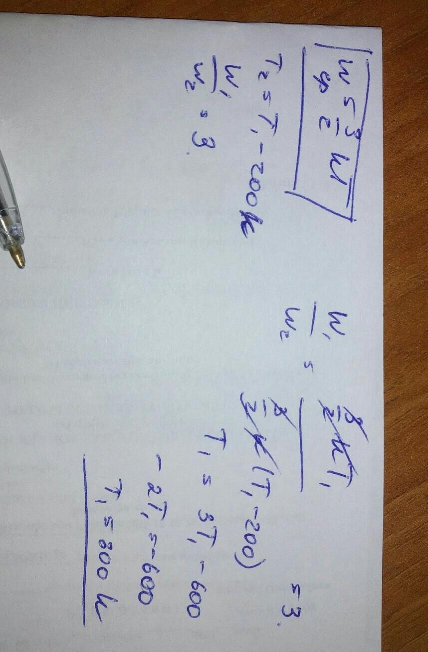 При понижении абсолютной температуры на 200 к средняя кинетическая энергия хаотического теплового движения молекул разреженного одноатомного газа уменьшилась в 3 раза. Какова начальная температура газа?