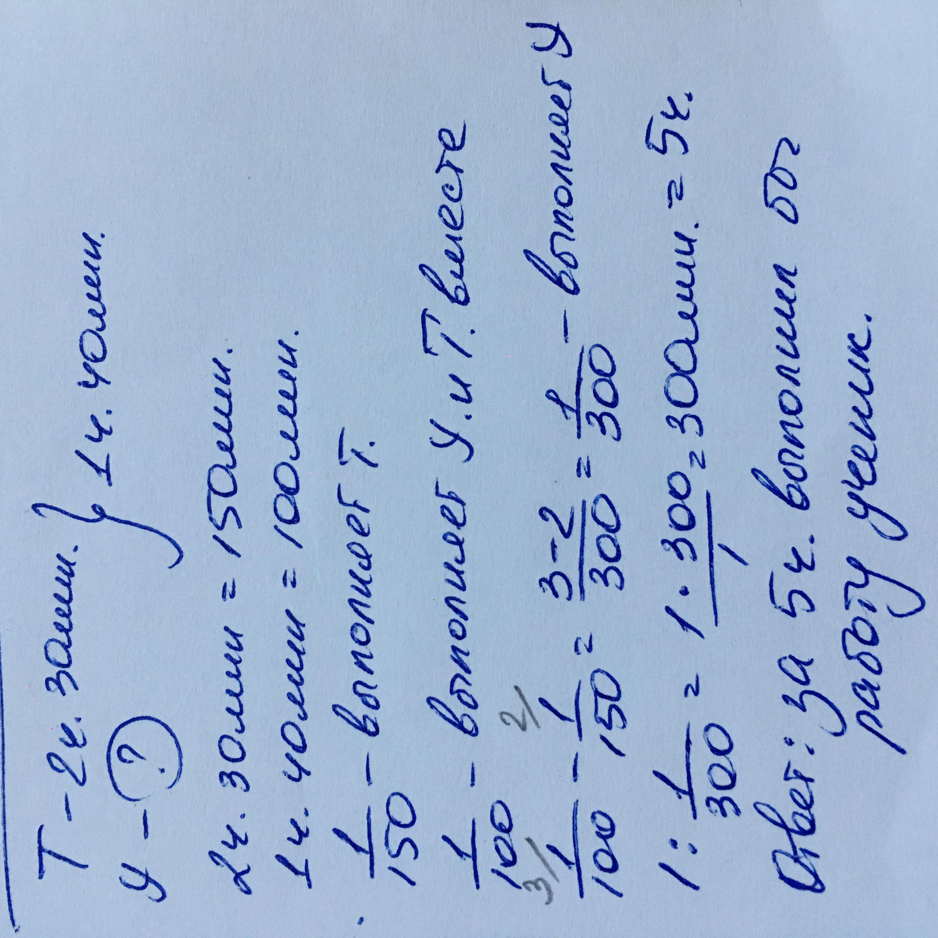 токарь и его ученик выполнили задание за 1 час 40 мин токарь мог бы выполнить это задание за 2 часа 30 минут. Сколько времени затратил бы ученик на выполнение этого задания?