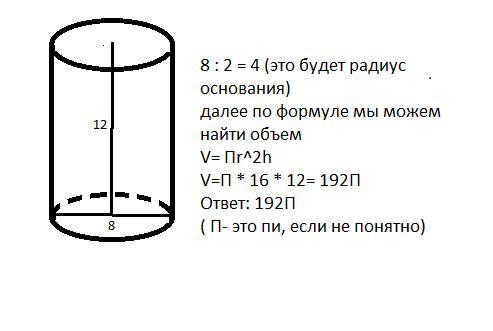 высота равна 12 потому что - диаметр 8 и если умножить на 1,5 это будет 12