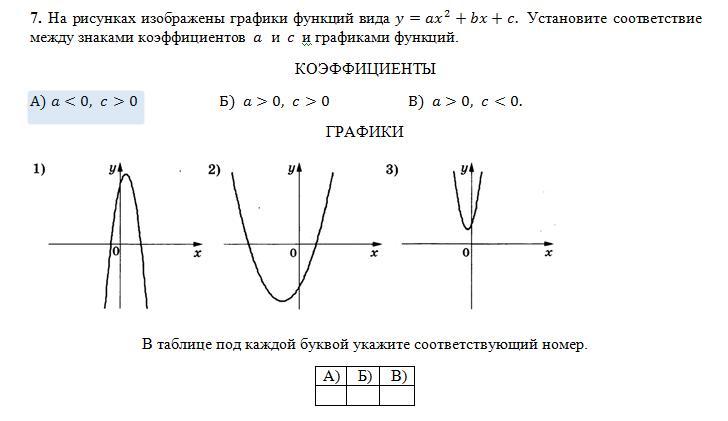 На рисунках изображены графики функций вида y=ax^2+bx+c. Установите соответствие между знаками коэффициентов a и c и графиками функций.