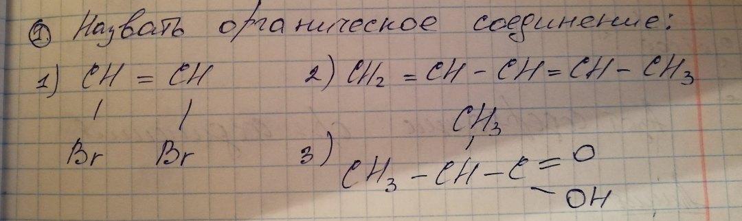 1) 1,2- дибромэтен; 2) пентадиен-1,3; 3) 2-метилпропановая кислота