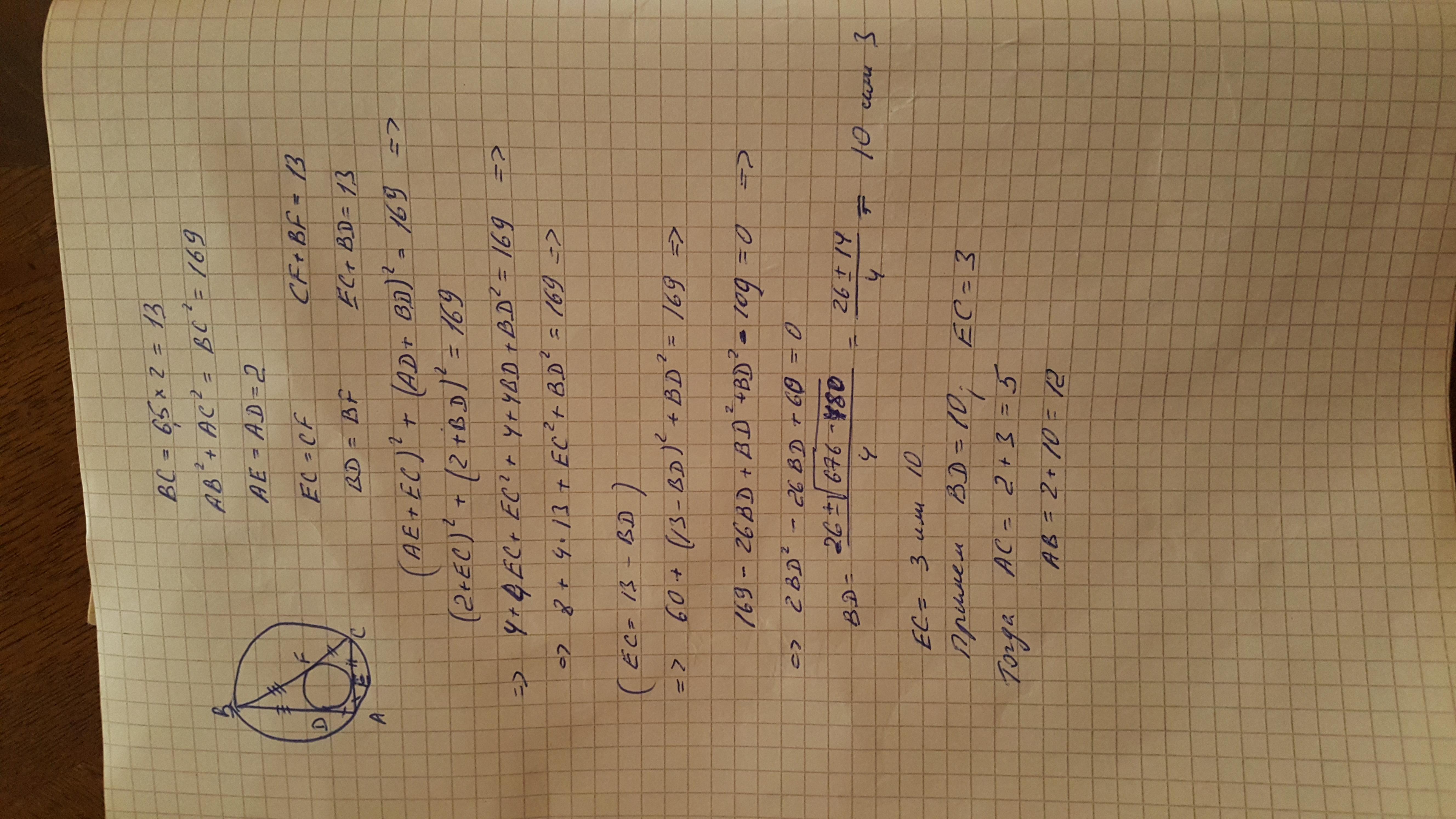 найдите катеты прямоугольного треугольника если известен радиус вписанной окружности 2,а радиус описанной окружности 6,5