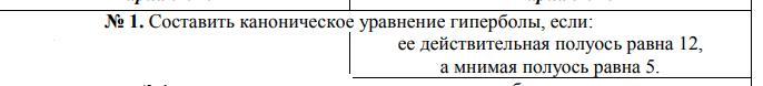 Каноническое уравнение гиперболы представимо в виде х²/а²-у²/в²=1, где а-длина действительной полуоси, в - длина мнимой полуоси. Искомое уравнение имеет вид х²/12²=у²/5²=1, или х²/144-у²/25=1