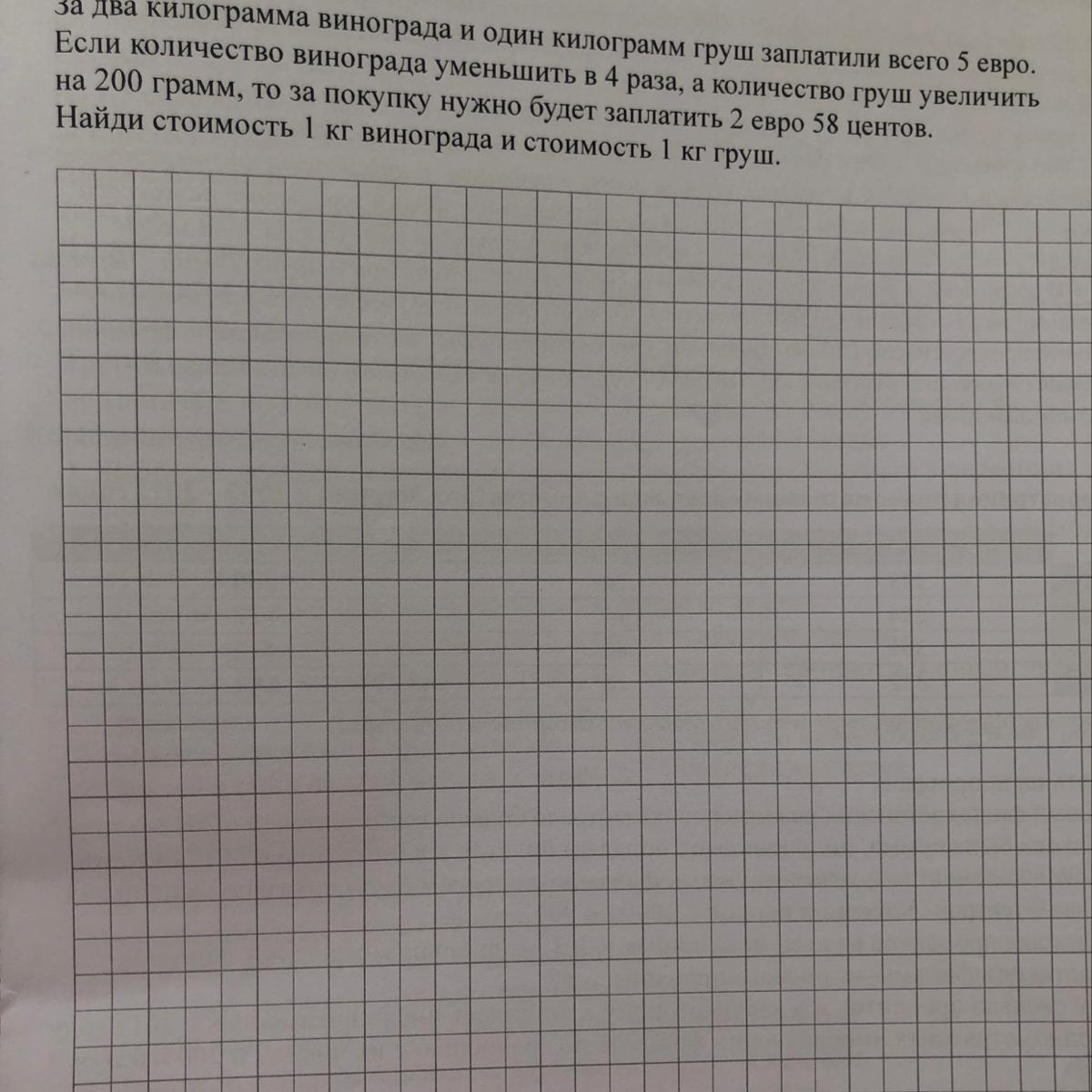 Значит 1 кг груш стоит 1.4 евро, а 1 кг винограда стоит => 2х+1.4=5 => х=1.8 евро