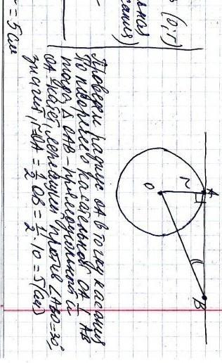 К окружности с центром O проведена касательная AB(A- точка касания.) Найдите радиус окружности, если OB=10см и угол ABO=30°