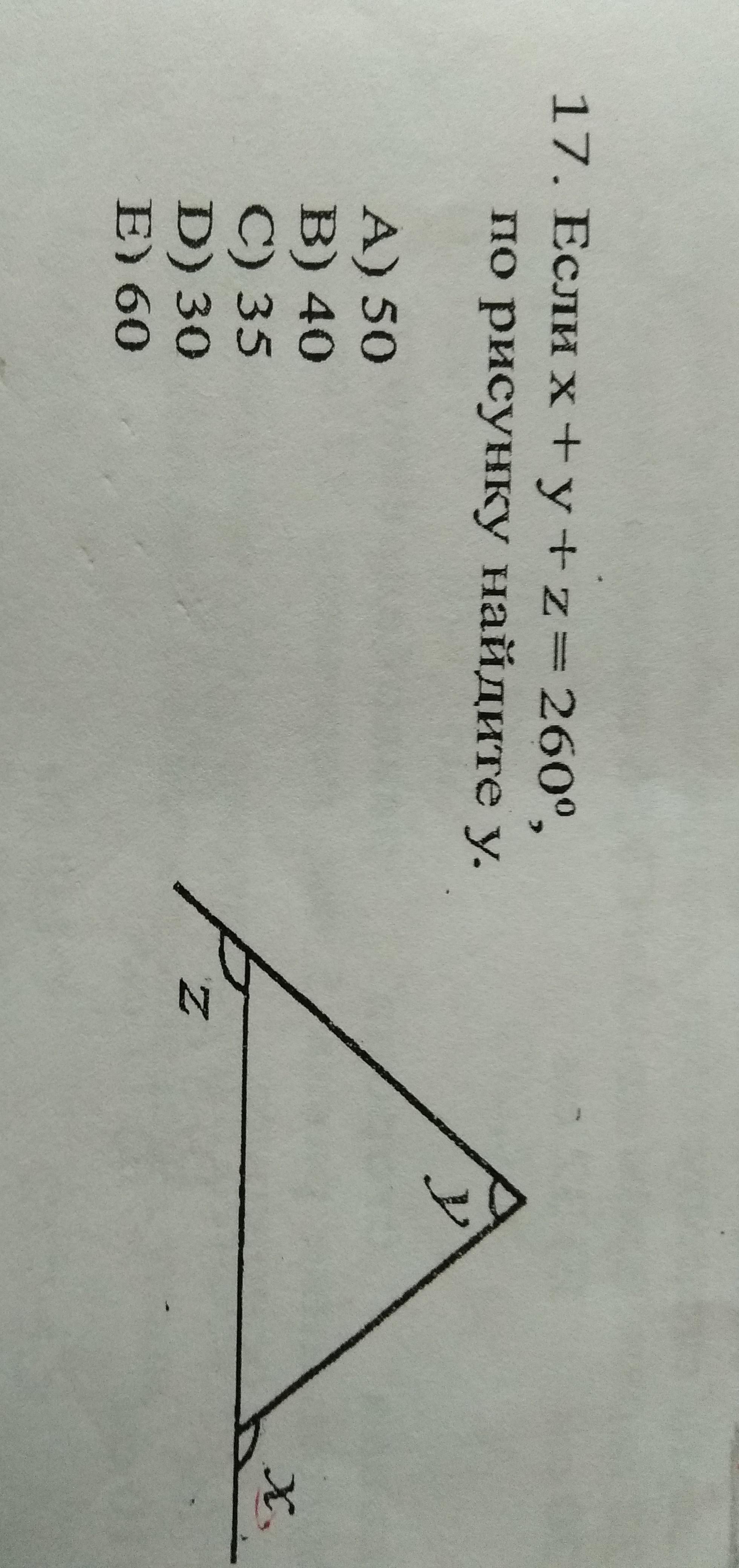(180-x)+(180-z)+y=180, -x+y-z=-180, решаем систему с уравнением условия х+у+z=260, сложим: 2у=80, у=40 -ответ В