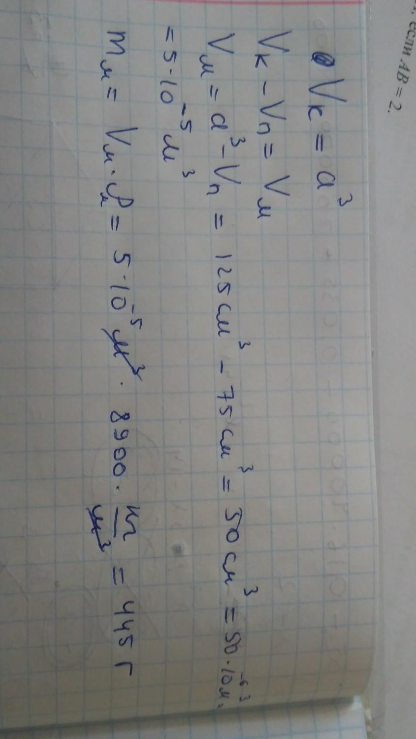 Медгый куб со стороной a=5 см имеет веутри полость обьемом 75 см^3(^3 - в третьей степени).Определите массу куба если плотность меди равна 8900 кг/м^3