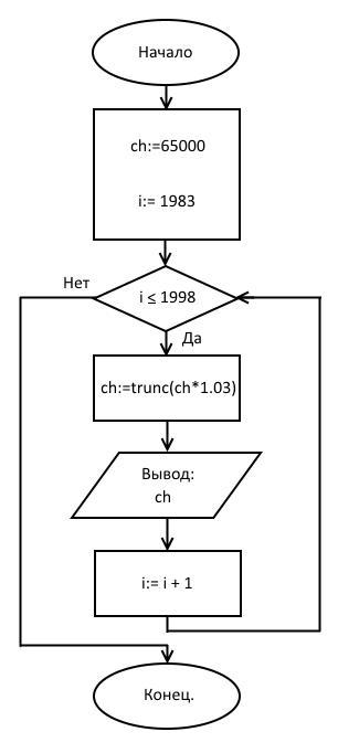 Население города увеличивается на 3% каждый год. В 1983 году население города составляло 65000. Напишите программу которая выведет на экран предсказываемую численность населения города в каждом году вплоть до 1999. Написать БЛОК-СХЕМУ. Мне нужна именно блок-схема. Программа уже составлена.