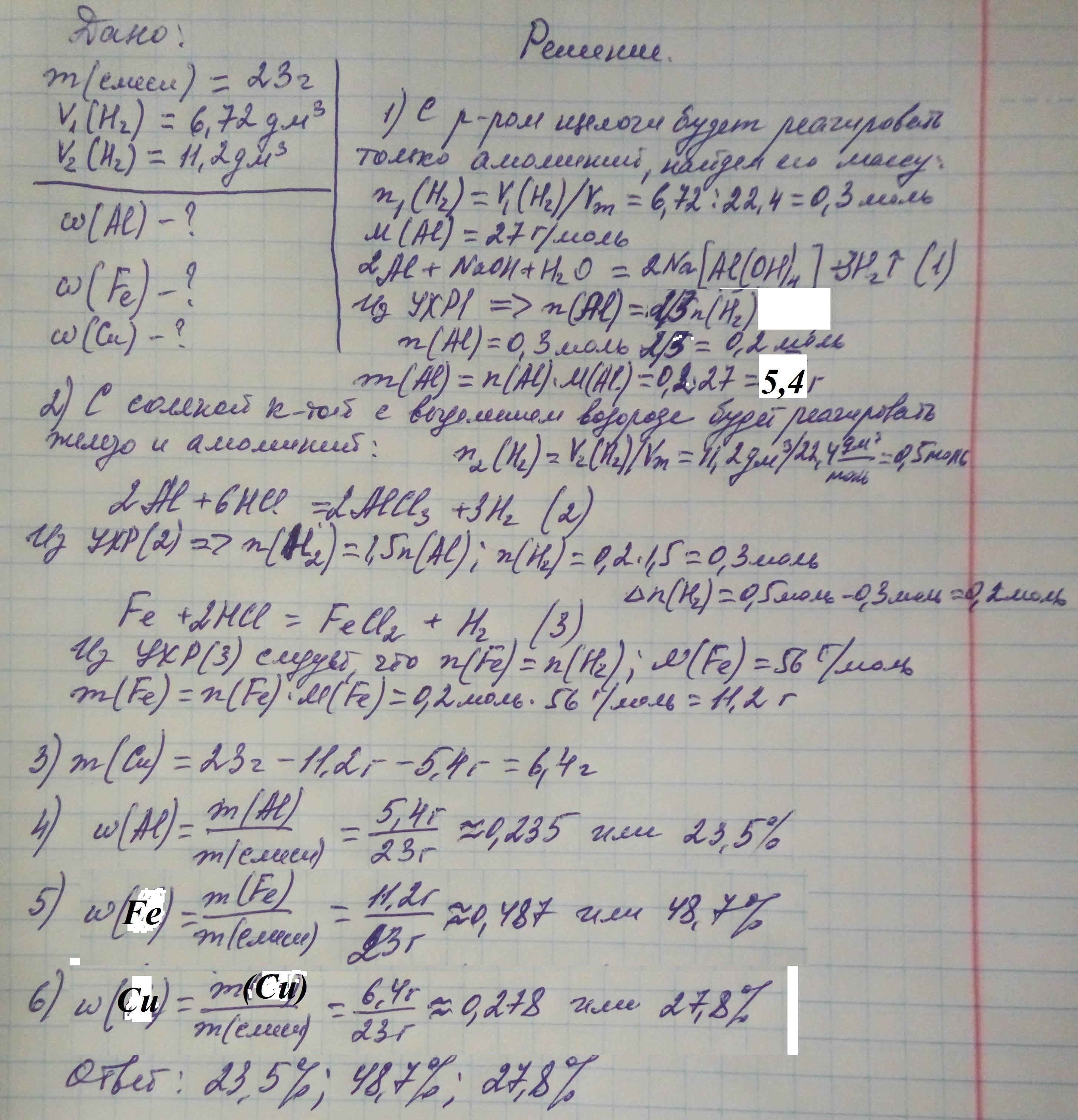 Определите состав смеси железа, меди и алюминия, если при действии на 23 г этой смеси раствором щелочи выделяется 6,72 дм3 газа, а при обработке той же массы смеси металлом соляной кислотой образуется 11,2 дм3 газа. Объемы газов измерены при нормальных условиях.