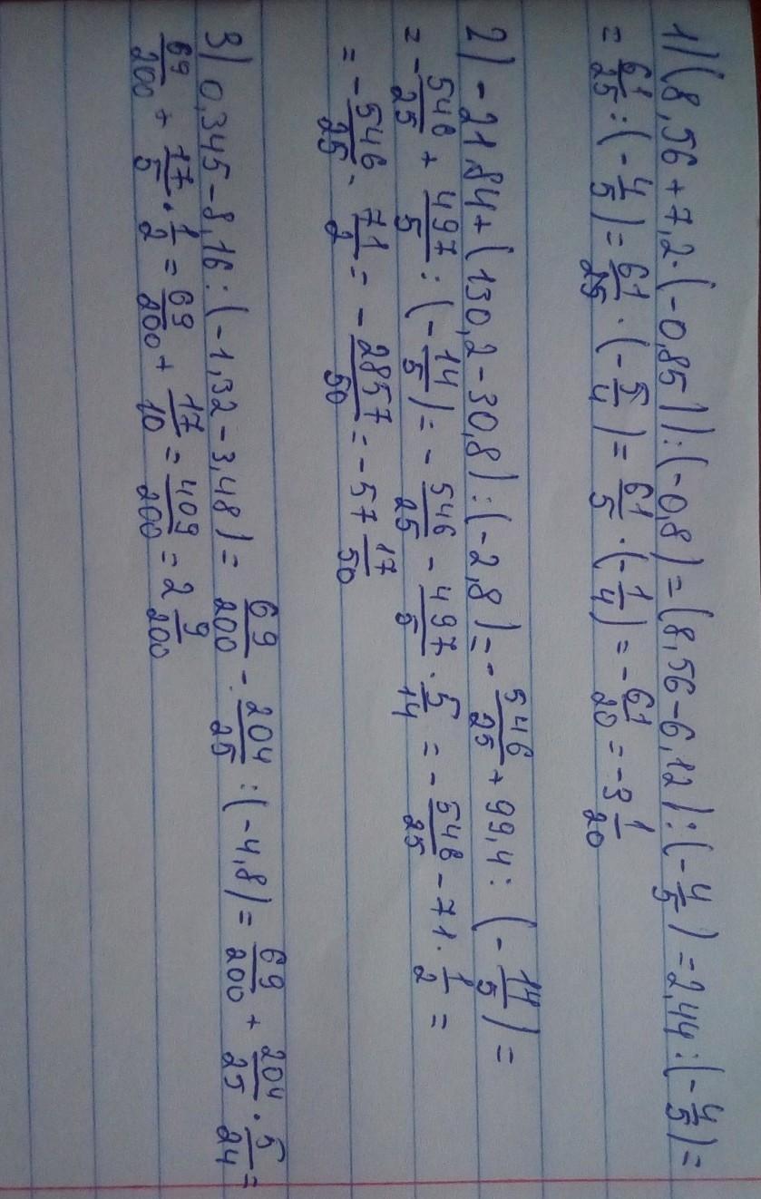 1) (8,56 + 7,2 * (-0,85)) : (-0,8) ;